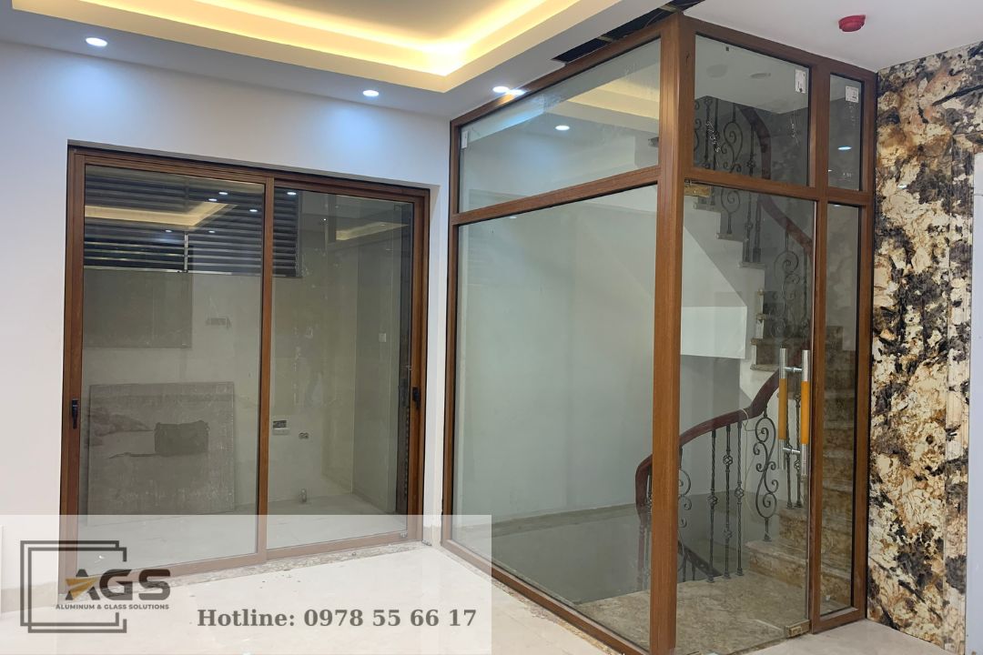 Vách kính màu vân gỗ kết hợp cửa kính bản lề thủy lực.